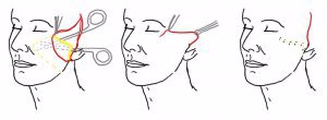Ansiktslyft: Ett vanligt ansiktslyft omfattar både ansikte och hals. Plastikkirurgen gör en öppning i huden från tinningen, framför örat och in bakom örat. Huden lossas från underlaget på kinden och ner mot halsen, sedan sträcks den försiktigt mot örat. Överflödig hud avlägsnas och öppningen stängs sedan.